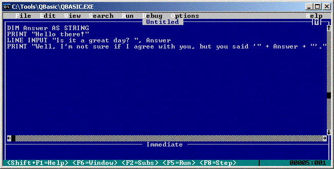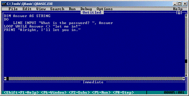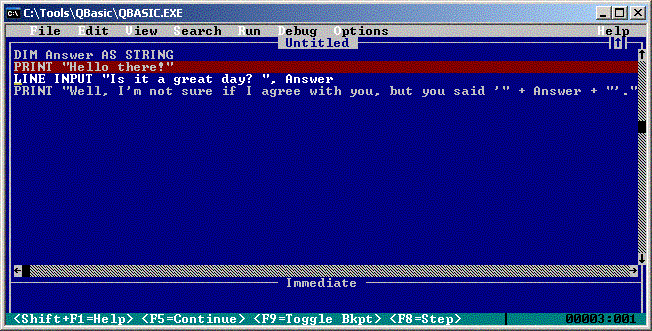 Put a breakpoint or single-step through to the "Loop While ..." line. I asked earlier, "Could it be useful to find out what values are in "Answer1" and "Answer2" at this point?". Here's how you can find out... 1) Press F6. You'll notice that the word "Immediate" towards the bottom of the screen becomes highlighted. If you didn't notice it, press F6 a few more times, and you'll notice that each time you press F6, one or other of "Untitled" and "Immediate" get highlighted, and the other un-highlighted. We call these "panes". So we might say "the code pane" or "the untitled pane" (both referring to the section entitled "Untitled"), or we might say "the immediate pane". Sometimes, if we're being a bit lazy, we might say "the code window" or "the untitled window" or particularly "the immediate window", but that's probably not the most technically accurate description of these sections of QBasic. (It is accurate for other IDEs, but let's not totally drown you in details!!! :o) ) So back to where we were - use F6 to make the immediate pane active. (You'll know it's active 'cause 1) the word "Immediate" will be highlighted; and 2) the keyboard input cursor will be somewhere in the blue box under the word "Immediate".) Phew! We got there. Now, type "Print Answer1" and press Enter. Whoa! What happened? The output screen came up again, and whatever we typed in as an answer to the first question has appeared on the screen again! Press any key and you get back to the IDE. Do you understand what happened? Any instruction that you type into the "Immediate" pane, if you press Enter, will be run immediately! ("Aha! Now I understand why they call it that!" :o) )